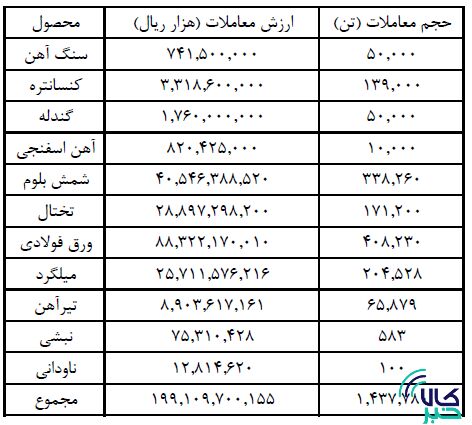 میزان سنگ آهن و کلوخه مورد معامله قرار گرفته ۵۰ هزار تن به ارزش ۷۴۱ میلیارد و ۵۰۰ میلیون ریال و آهن اسفنجی نیز ۱۰ هزار تن به ارزش ۸۲۰ میلیارد و ۴۲۵ میلیون ریال بوده است.
