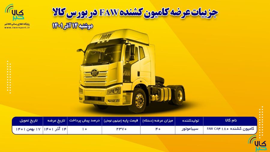 سیبا موتور میخواهد ۴۰ دستگاه کامیون کشنده FAW CA۴۱۸۰ را در بورس کالا دوشنبه هفته جاری (۱۴ آذر) عرضه کند. قیمت پایه این محصول؛ ۲ میلیارد و ۳۷۰ میلیون تومان، تاریخ تحویل؛ ۱۷ بهمن و درصد پیش پرداخت سفارش خرید؛ ۱۰ درصد تعیین شد.