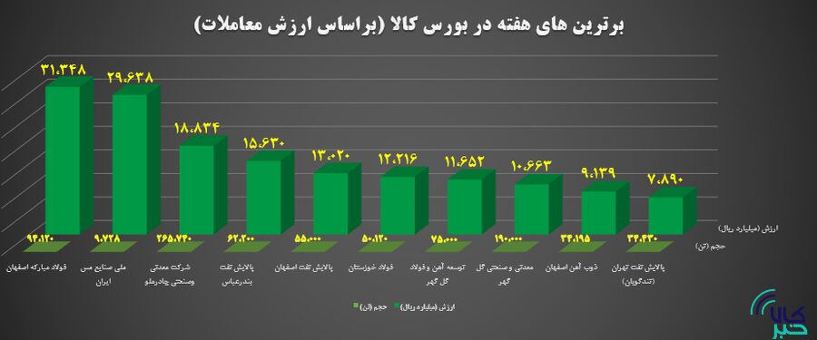 آمار معاملات بازار فیزیکی بورس کالای ایران نشان می دهد در هفته منتهی به ۳۰ آذر ماه بالغ بر ۲ میلیون و ۵۶۶ هزار تن انواع کالا و محصول به ارزش بیش از ۳۲هزار میلیارد تومان معامله شد همچنین ارزش معاملات ۱۰ شرکت برتر به بیش از ۱۶هزار میلیارد تومان رسید.