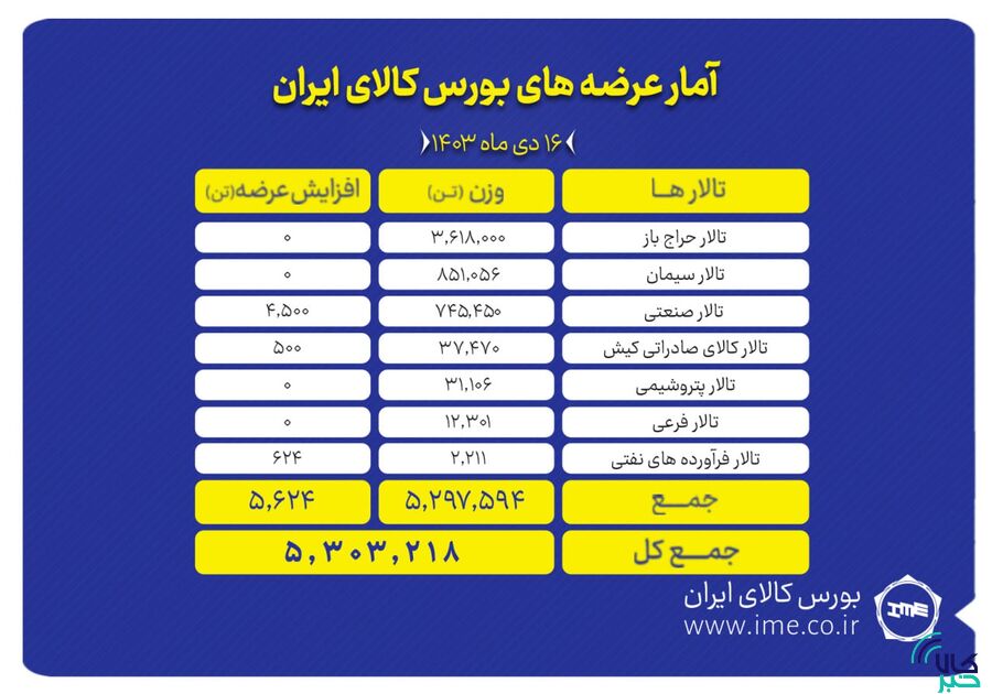 همچنین ۸۵۱ هزار و ۵۶ تن سیمان نیز در تالار سیمان روی تابلوی عرضه می رود.