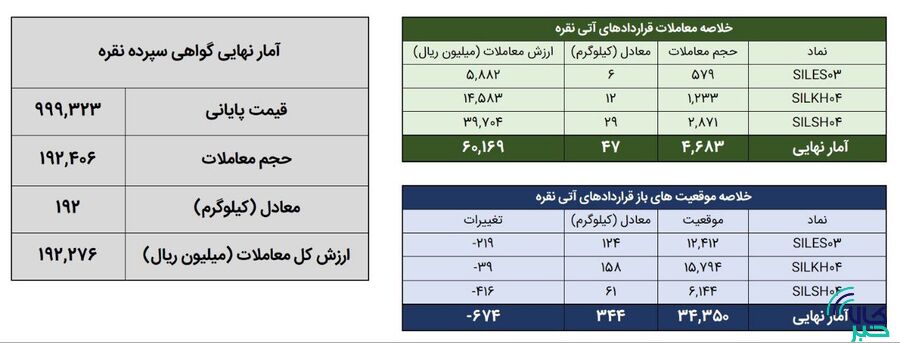 همچنین ۴ هزار و ۶۸۳ قرارداد معادل ۴۷ کیلوگرم شمش نقره به ارزش ۶ میلیارد تومان در بازار آتی منعقد شد. در پایان روز معاملاتی گذشته موقعیت های باز قراردادهای آتی نقره تقریبا معادل ۳۴۴ کیلو شمش نقره بود.