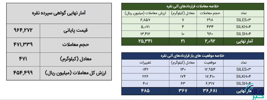 همچنین ۲هزار و ۹۲ قرارداد معادل ۲۱ کیلوگرم شمش نقره به ارزش ۲.۵ میلیارد تومان در بازار آتی منعقد شد. در پایان روز معاملاتی گذشته موقعیت های باز قراردادهای آتی نقره تقریبا معادل ۳۶۷ کیلوگرم شمش نقره بود.