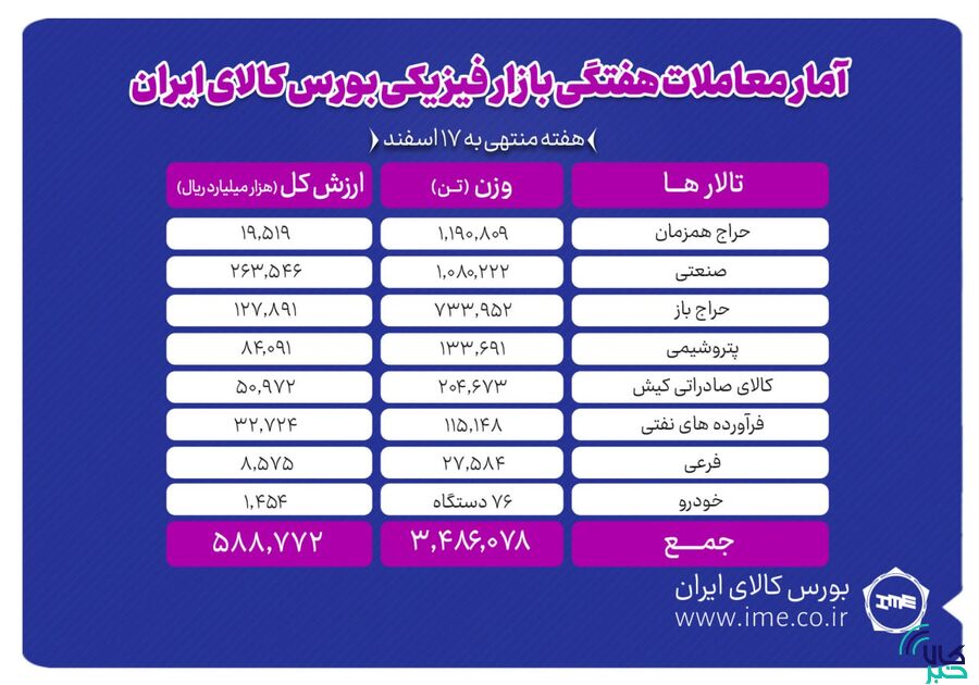 در این تالار یک میلیون و ۱۹۰ هزار و ۸۰۹ تن سیمان، ۹۹۰ هزار تن سنگآهن، ۴۵۰ هزار و ۵۷۲ تن فولاد، ۲۵۰ هزار و ۸۰۰ تن آهن اسفنجی، ۹ هزار و ۷۰ تن آلومینیوم، ۸ هزار و ۲۵۰ تن مس، یک هزار و ۴۹۰ تن شمش روی، ۴۵۰ تن کنسانتره مولیبدن و ۸۰ تن مولیبدن معامله شد.
