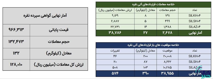 همچنین ۲هزار و ۶۷۸ قرارداد معادل ۲۷ کیلوگرم شمش نقره به ارزش ۳.۸ میلیارد تومان در بازار آتی منعقد شد. در پایان روز معاملاتی گذشته موقعیت های باز قراردادهای آتی نقره تقریبا معادل ۳۹۰ کیلوگرم شمش نقره بود.