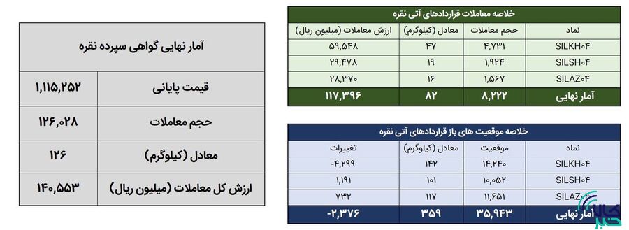 همچنین ۸ هزار و ۲۲۲ قرارداد معادل ۸۲ کیلوگرم شمش نقره به ارزش ۱۱.۷میلیارد تومان در بازار آتی منعقد شد. در پایان روز معاملاتی گذشته موقعیت های باز قراردادهای آتی نقره تقریبا معادل ۳۵۹ کیلوگرم شمش نقره بود.