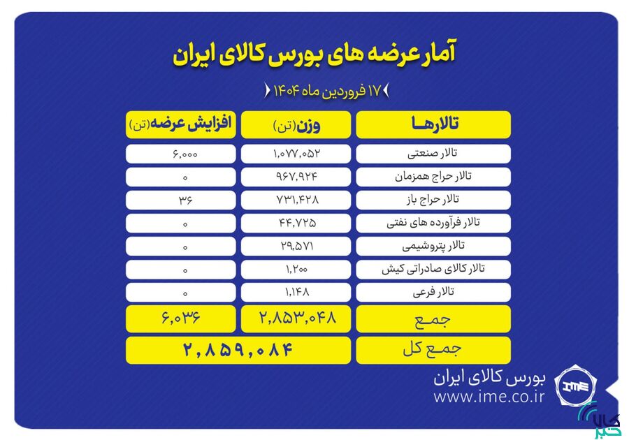 تالارهای بورس کالای ایران در نخستین روز هفته (یکشنبه ۱۷ فروردین ماه) میزبان عرضه ۲ میلیون و ۸۵۹ هزار و ۸۴ تن انواع کالا و محصول است.