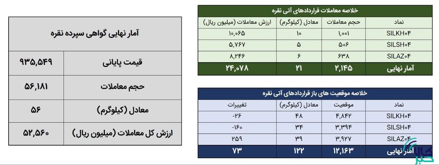 همچنین ۲ هزار و ۱۴۵ قرارداد آتی معادل ۲۱ کیلوگرم شمش نقره به ارزش ۲.۴ میلیارد تومان منعقد شد. در پایان روز معاملاتی گذشته موقعیت های باز قراردادهای آتی نقره معادل ۱۲۲ کیلوگرم شمش نقره بود.