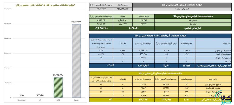 در قراردادهای اختیار معامله مبتنی بر طلا نیز ۲۲ هزار و ۵۴ قرارداد به ارزش حدود ۱.۱ میلیارد تومان دادوستد شد.همچنین هزار و ۷۰ قراردادآتی مبتنی بر طلا به ارزش ۱۳ میلیارد تومان دادوستد شد.