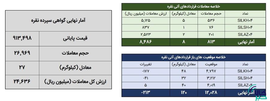 در روز ۱۶ اردیبهشت ماه در مجموع حدود ۳۵ کیلوگرم شمش نقره در بازار گواهی سپرده و قرارداد آتی مورد معامله قرار گرفت.