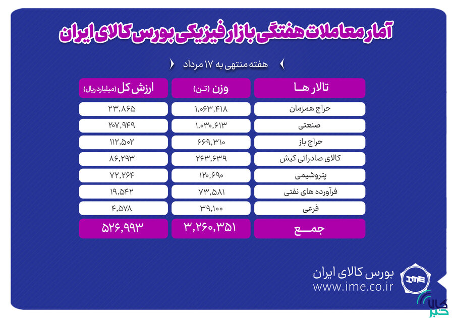 در این تالار یک میلیون و ۶۳ هزار و ۴۱۸ تن سیمان، یک میلیون و ۹ هزار تن سنگ آهن، ۳۳۰ هزار و ۸۰۳ تن فولاد، ۲۳۶ هزار و ۸۰۰ تن آهن اسفنجی، ۳۰ هزار و ۱۱۵ تن روی، ۱۵ هزار و ۷۰ تن آلومینیوم، ۹ هزار و ۴۲۵ تن مس و ۲۲۰ تن کنسانتره مولیبدن معامله شد.