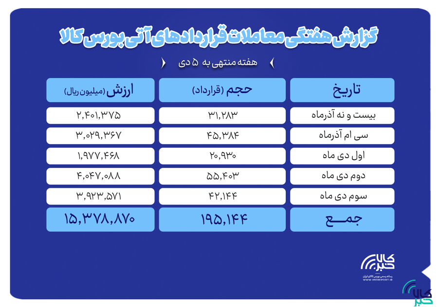 به گزارش کالاخبر،در هفته گذشته ۱۹۵هزار و ۱۴۴ قرارداد آتی به ارزش هزار و ۵۳۷ میلیارد تومان منعقد شد. بیشترین حجم و ارزش معاملات نیز به روز دوم دی ماه اختصاص یافت به طوری که در این روز ۵۵ هزار و ۴۰۳ قرارداد به ارزش بیش از ۴۰۴ میلیارد تومان منعقد شد.