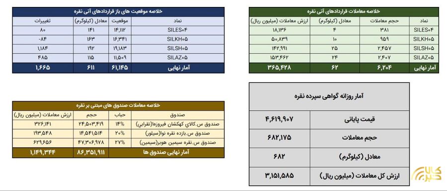در صندوق های مبتنی بر نقره نیز ۸۶ میلیون و ۳۵۲ هزار واحد به ارزش ۱۱۴.۹ میلیارد تومان مورد دادوستد قرار گرفت.