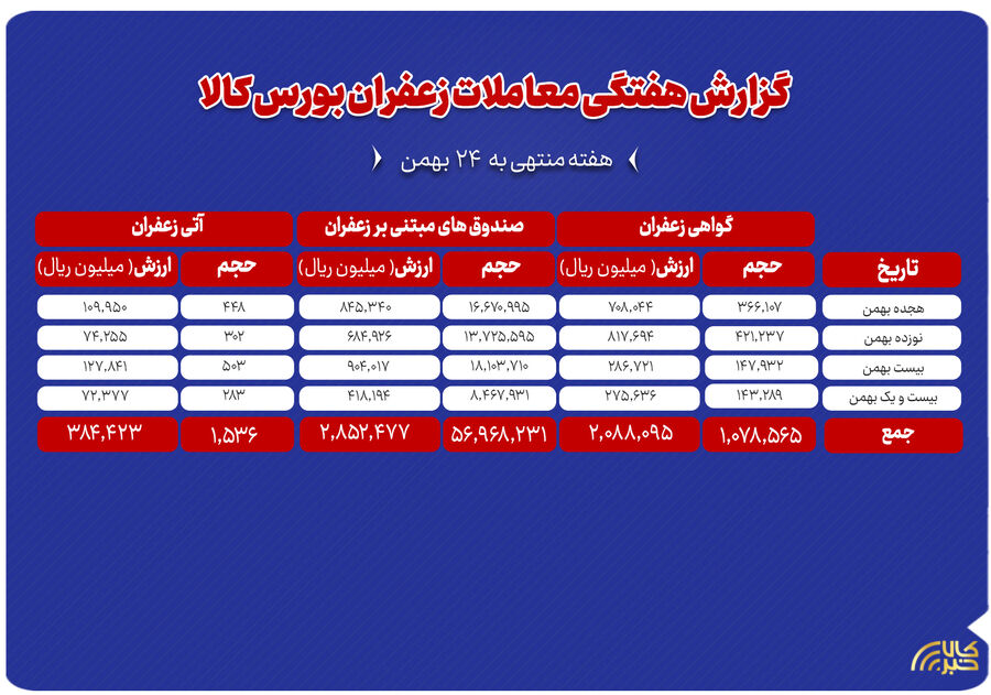 گزارش هفتگی معاملات زعفران نشان می‌دهد که در هفته منتهی به ۲۴ بهمن ماه ۱۵۴ کیلوگرم زعفران نگین به ارزش ۳۸.۴ میلیارد تومان در بازار آتی بورس کالا داد و ستد شد.