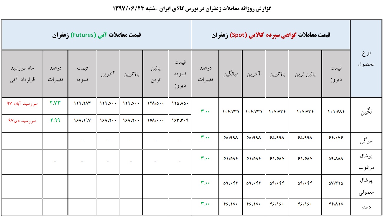 • جدول روزانه معاملات زعفران در بورس کالا ( ۱۳ شهریور ماه ۹۷)