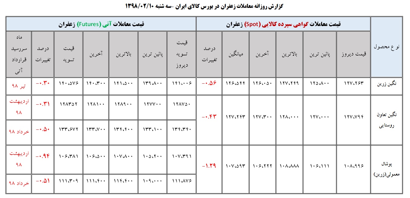 جدول روزانه معاملات زعفران در بورس کالا ( ۱۰ اردیبهشت ماه ۹۸)