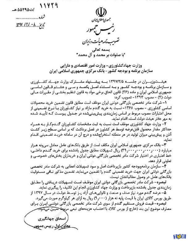 «شرکت مادر تخصصی بازرگانی دولتی ایران موظف است مطابق قانون تضمین خرید محصولات اساسی کشاورزی - مصوب ۱۳۶۸- نسبت به خرید گندم مازاد بر نیاز کشاورزان با نرخ تضمینی از محل اعتبارات مصوب مربوط بر اساس زمان بندی پیش بینی شده در جدول پیوست که تأیید شده به مهر دفتر هیئت دولت است، اقدام نماید».