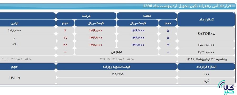 به گزارش «کالاخبر»، در جریان بازگشایی نماد معاملاتی سررسید اردیبهشت ماه ۹۸ قرارداد آتی زعفران نگین معامله گران هر گرم زعفران نگین را در اولین معامله به قیمت ۱۳۸ هزار ریال معامله کردند.