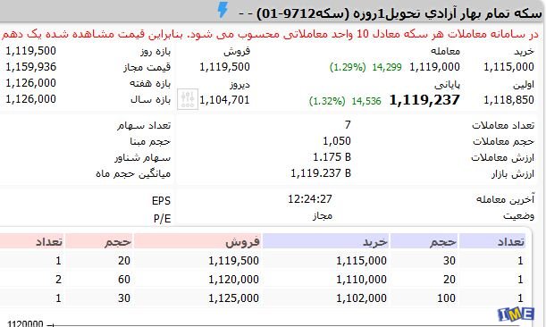 همچنین نگاهی به آمار معاملات امروز نشان می دهد که آخرین قیمت سکه در قالب گواهی سپرده، حدود یک میلیون و ۱۱۹ هزار تومان مورد معامله قرار گرفته است. همچنین در صف خرید پیشنهاد متقاضییان سکه یک میلیون و ۱۱۵ هزار تومانی بوده و پیشنهاد فروش سکه به صورت آنلاین در بورس کالا نیز یک میلیون و ۱۱۹ هزار و ۵۰۰ تومان بوده است.