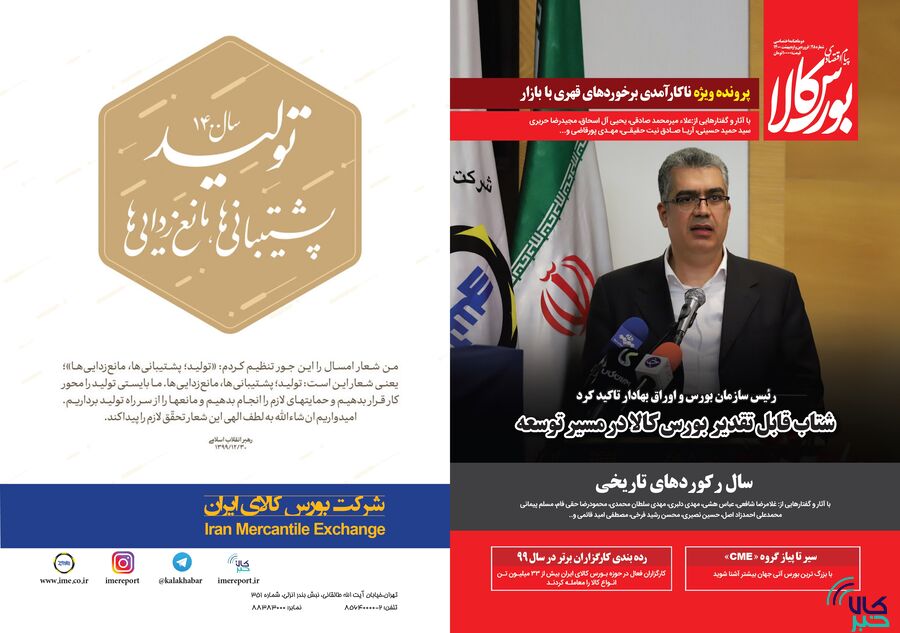 فصل نمای ۹۹ به مهم ترین رویدادهای بورس کالا در سال ۹۹ اشاره کرده است. همچنین در این فصل، مزایای گواهی سپرده کالایی مورد بررسی قرار گرفته است. فصل نبض بورس نیز به پرونده ویژه این شماره یعنی ناکارآمدی برخوردهای قهری با بازار اختصاص داشته و در نهایت در فصل آخر بورس های کالایی جهان و چشم انداز بازار کالا در سال جاری میلادی مورد رصد قرار گرفته اند.