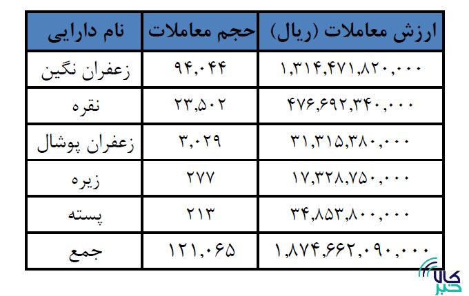 انعقاد ۳۰۲۹ قرارداد آتی زعفران پوشال نیز ارزشی بالغ بر ۳۱ میلیارد و ۳۱۵ میلیون ریال را در پی داشت.