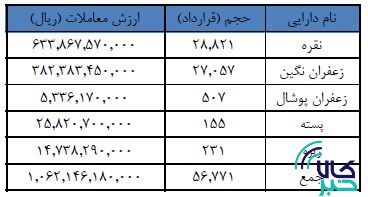 ۵۰۷ قرارداد آتی زعفران پوشال نیز در بازار منعقد شد و ارزش تقریبی ۵ میلیارد و ۳۳۶ میلیون ریالی را برای آن رقم زد.