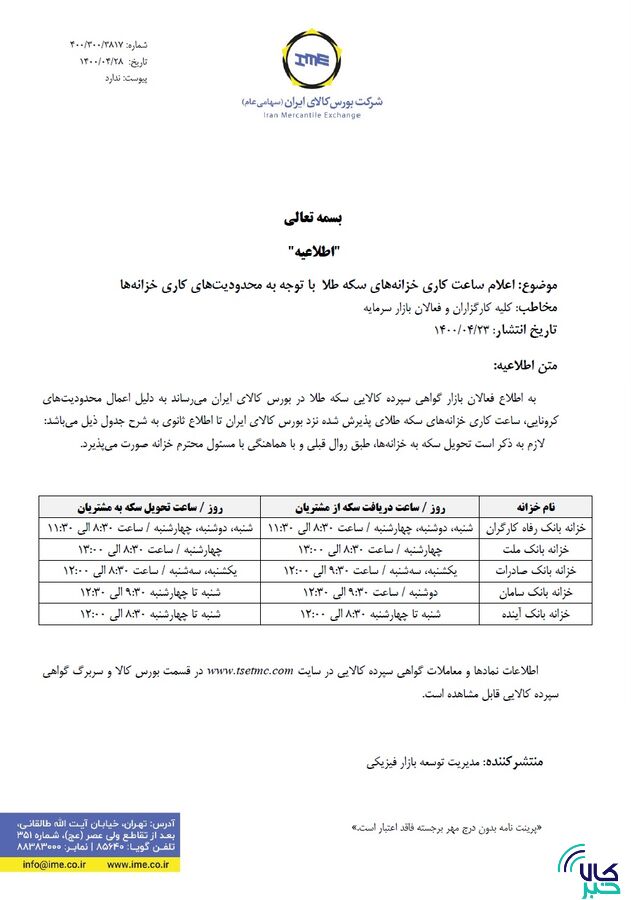 براساس اطلاعیه منتشره که مخاطب آن کلیه کارگزاران و فعالان بازار سرمایه هستند، به دلیل اعمال محدودیت های کرونایی، ساعت کاری خزانه های سکه طلای پذیرش شده نزد بورس کالای ایران تا اطلاع ثانوی به شرح زیر است.