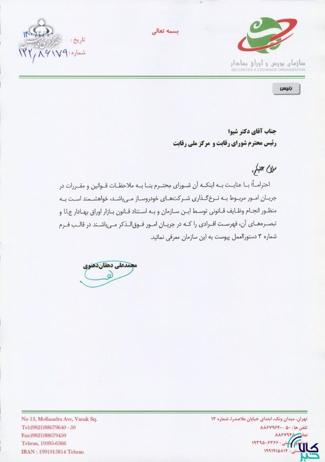 به گزارش «کالاخبر» به نقل از خبرگزاریفارس، محمد علی دهقان دهنوی، رئیس سازمان بورس و اوراق بهادار در نامهای به رضا شیوا رئیس شورای رقابت از وی خواست تا فهرست افرادی که در جریان امور مربوط به قیمت گذاری خودرو هستند را به این سازمان معرفی کند.