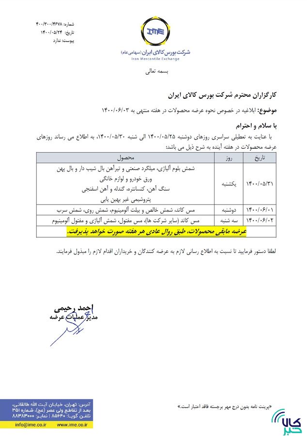 براساس نامه مذکور عرضه مابقی محصولات طبق روال عادی هفته صورت خواهد پذیرفت.