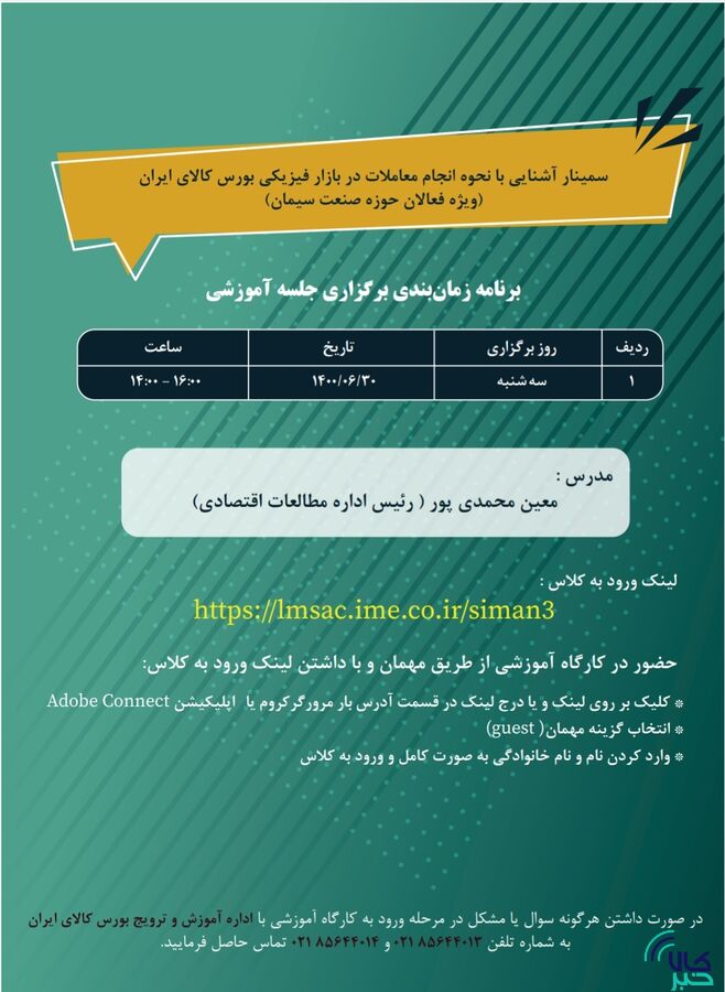 بورس کالای ایران نوبت سوم سمینار "آشنایی با نحوه انجام معاملات در بازار فیزیکی" را با توجه به استقبال از دو سمینار قبلی که در راستای راستای آشنایی فعالان حوزه صنعت سیمان با معاملات این محصول در بورس کالا برگزار شده بود، به صورت رایگان و آنلاین برگزار می کند.
