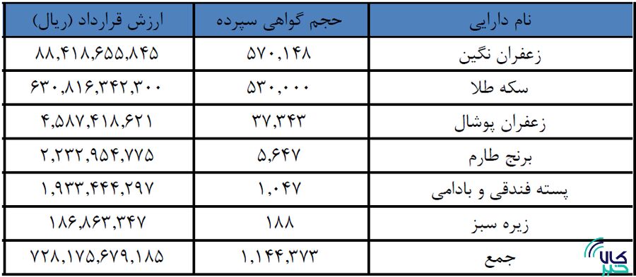 پس از آن سکه طلا با ۵۳۰ هزار گواهی سپرده به ارزش ۶۳۰ میلیارد و ۸۱۶ میلیون ریالی به لحاظ حجم در جایگاه دوم ایستاد و به این ترتیب زعفران صدر جدول را پس گرفت و مجددا اول شد با این حال هنوز به لحاظ ارزش معاملات پس از سکه طلا قرار دارد.