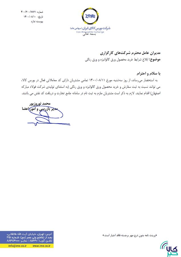 به گزارش «کالاخبر»؛ در این نامه آمده است از روز سه شنبه ۱۱ آبان ماه تمامی مشتریان دارای کد معاملاتی فعال در بورس کالا می توانند نسبت به ثبت سفارش و خرید محصول ورق گالوانیزه و ورق رنگی (به استثنای تولیدی شرکت فولاد مبارکه اصفهان) اقدام کنند.