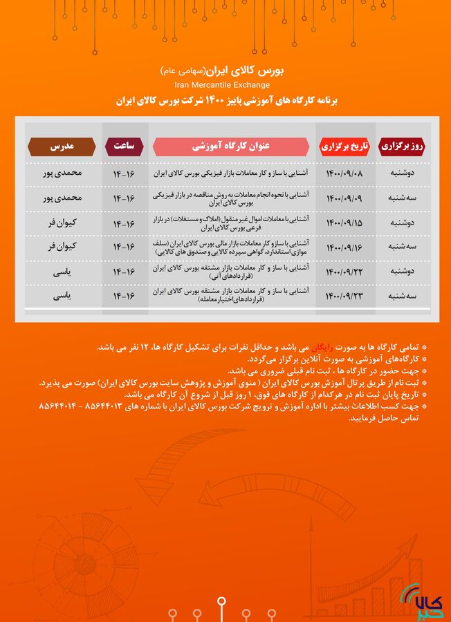 این گزارش می افزاید، تمامی کارگاه های آموزشی بورس کالای ایران به صورت رایگان برگزار می شود و حداقل نفرات برای تشکیل کارگاه ها ۱۲ نفر اعلام شده است.