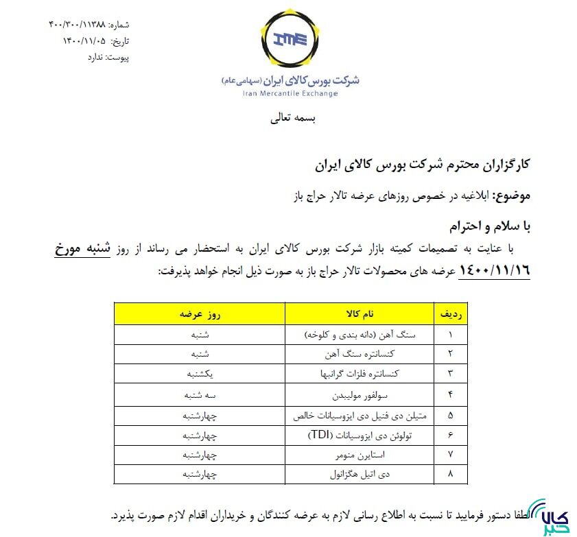 به گزارش «کالاخبر»؛ در این نامه آمده است: با عنایت به تصمیمات کمیته بازار شرکت بورس کالای ایران از روز شنبه ۱۶ بهمن ماه عرضه محصولات تالار حراج باز به صورت زیر انجام خواهد شد: