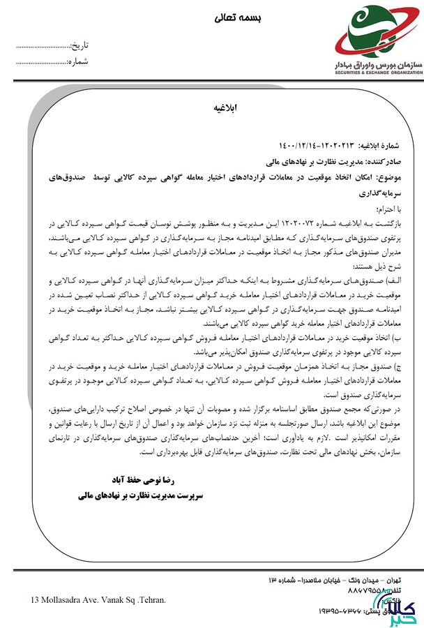 در نامه این مدیریت آمده است: به منظور پوشش نوسان قیمت گواهی سپرده کالایی در پرتفوی صندوق های سرمایه گذاری که مطابق امیدنامه مجاز به سرمایه گذاری در گواهی سپرده کالایی هستند، مدیران صندوق های مذکور مجاز به اتخاذ موقعیت در معاملات قراردادهای اختیار معامله گواهی سپرده کالایی خواهند بود.