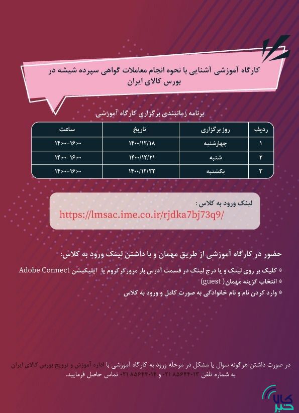 به گزارش « کالاخبر »، براساس برنامه زمان بندی اعلام شده، برگزاری کارگاه آموزشی آشنایی با نحوه انجام معاملات گواهی سپرده شیشه در بورس کالا از فردا به مدت سه روز و از ساعت ۱۴ تا ۱۶ خواهد بود.