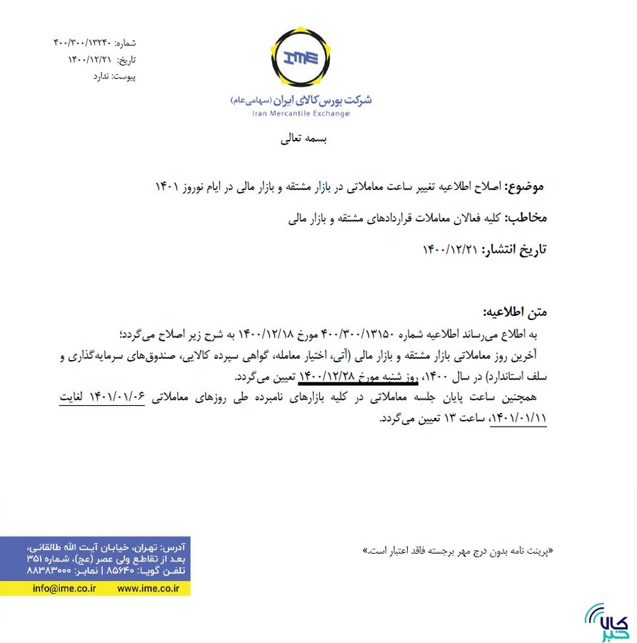 براساس همین اطلاعیه، ساعت پایان جلسه معاملات در همه بازارهای نامبرده در روزهای ۶ تا ۱۱ فروردین ۱۴۰۱ مطابق اطلاعیه قبلی ساعت ۱۳ تعیین میشود.