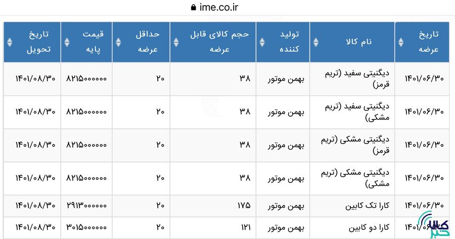 به گزارش کالاخبر ، براساس اطلاعیه عرضه بورس کالای ایران، روز چهارشنبه ٣٠ شهریور ماه ٣٨ خودروی دیگنیتی سفید (تریممشکی)، ٣٨ خودروی دیگنیتی سفید (تریم قرمز)، ٣٨ خودروی دیگنیتی مشکی (تریم مشکی)، دیگنیتی مشکی (تریم قرمز) هر یک باقیمت پایه ٨٢١ میلیون و ۵٠٠ هزار تومان روی تابلو می‌رود. همچنین تالار خودروی بورس کالا چهارشنبه هفته بعد میزبان عرضه ١٧۵ دستگاه کارای تک کابین گروه بهمن با قیمت پایه ٢٩١ میلیون و٣٠٠ هزار تومان و ۱۲۱ دستگاه کارای دو کابین با قیمت پایه ۳۰۱ میلیون و ۵۰۰ هزار تومان خواهد بود.