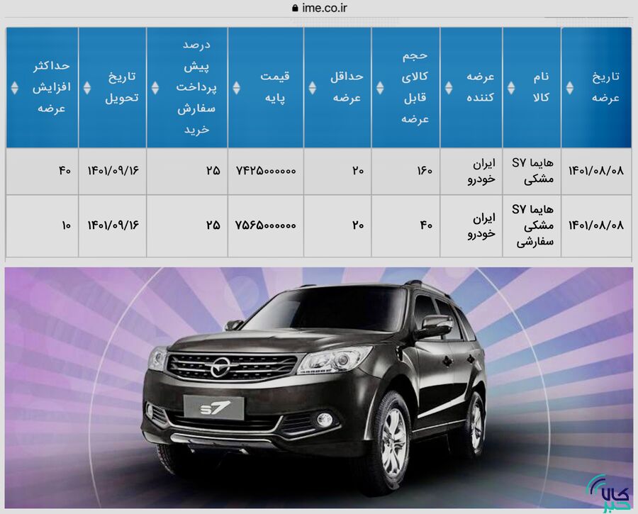 به گزارش کالاخبر ، در اطلاعیه عرضه بازار فیزیکی بورس کالای ایران آمده است ۸ آبان ۲۰۰ دستگاه هایما S۷ مشکی و ۵۰ دستگاه هایما S۷ مشکی سفارشی در تالار خودرو عرضه می شود.