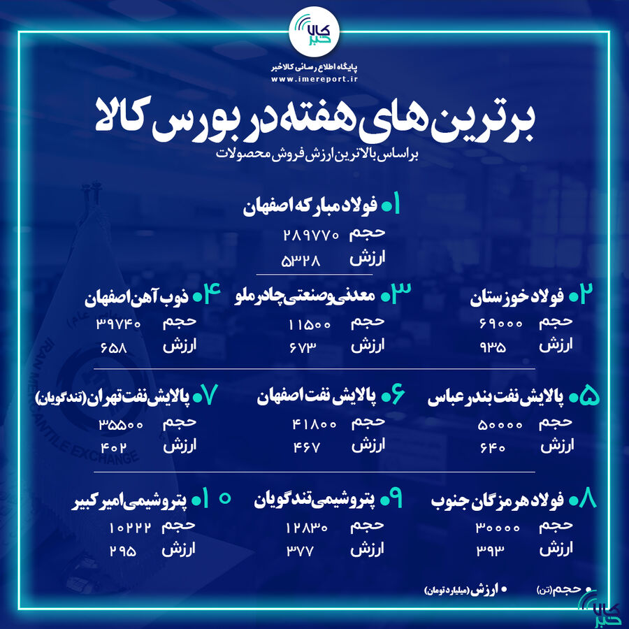 به گزارش کالاخبر ، بورس کالای ایران برترین های بورس کالا را در هفته دوم آبان (منتهی به ۲۰ آبان) براساس ارزش فروش شرکت ها در بازار فیزیکی اعلام کرد.