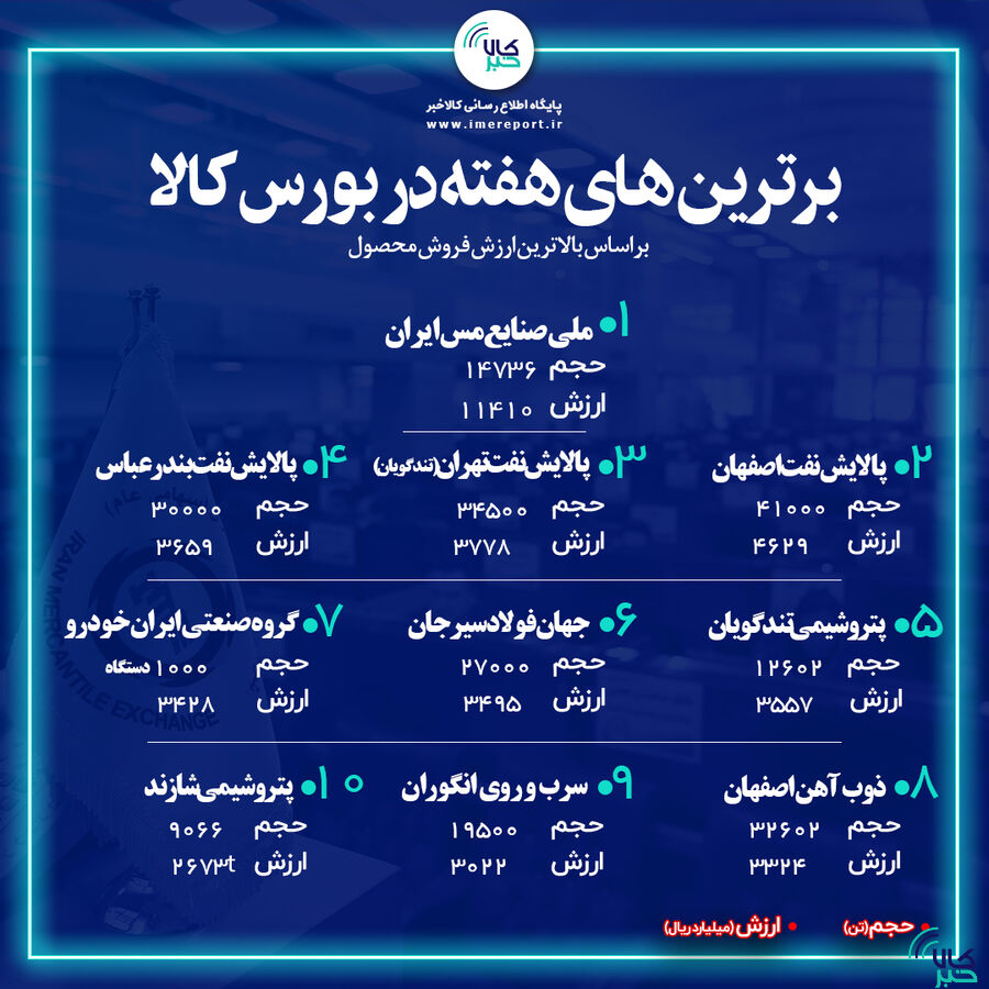 به گزارش کالاخبر ، بورس کالای ایران برترین های بورس کالا را در هفته اول آذر (منتهی به ۴ آذر) براساس ارزش فروش شرکت ها در بازار فیزیکی اعلام کرد.