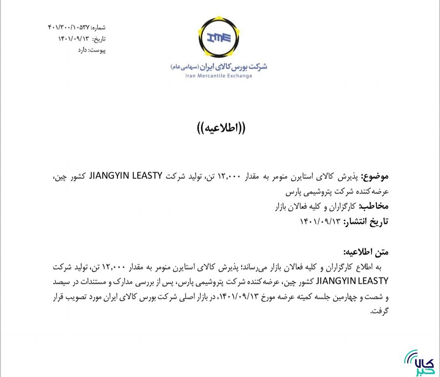 به گزارش کالاخبر ، براساس جدیدترین اطلاعیه مدیریت پذیرش بورس کالای ایران، ۱۲ هزار تن استایرن منومر شرکت JIANGYIN LEASTY کشور چین که عرضه کننده آن شرکت پتروشیمی پارس است در بازار اصلی بورس کالا پذیرش شد.