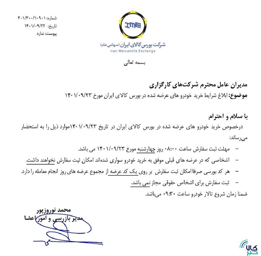 به گزارش کالاخبر ، براساس جدیدترین نامه مدیر بازرسی و امور اعضا بورس کالا ایران مهلت ثبت سفارش ساعت ۸ صبح روز چهارشنبه ۲۳ آذر بوده و اشخاصی که در عرضه های قبلی موفق به خرید خودرو سواری شده اند امکان ثبت سفارش را نخواهند داشت.