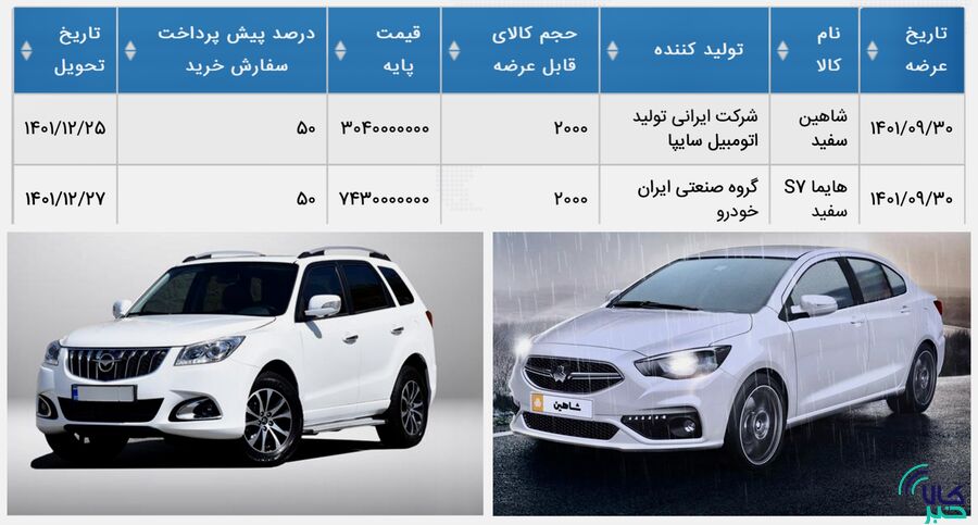 بورس کالا همچنین طبق اعلام قبلی چهارشنبه ۳۰ آذر میزبان عرضه ۲۰۰۰ دستگاه خودرو شاهین نیز خواهد بود. قیمت پایه اینخودروها ۳۰۴ میلیون تومان و درصد پیش پرداخت سفارش خرید ۵۰ درصد در نظر گرفته شده است. این خودروها ۲۵ اسفند به مشتریانتحویل می شود.