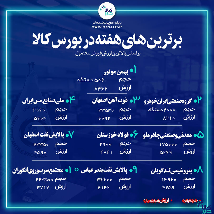 به گزارش کالاخبر ، بورس کالای ایران برترین های بورس کالا را در هفته منتهی به ۹ دی براساس ارزش فروش شرکت ها در بازار فیزیکی اعلام کرد.