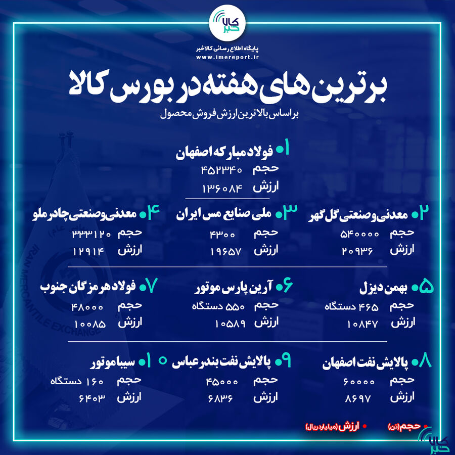 فولاد مبارکه اصفهان، معدنی و صنعتی گل گهر و ملی صنایع مس ایران ۳ شرکت برتر بودند که بیشترین فروش بازار فیزیکی بورس کالای ایران در هفته سوم اسفند به ثبت رساندند.