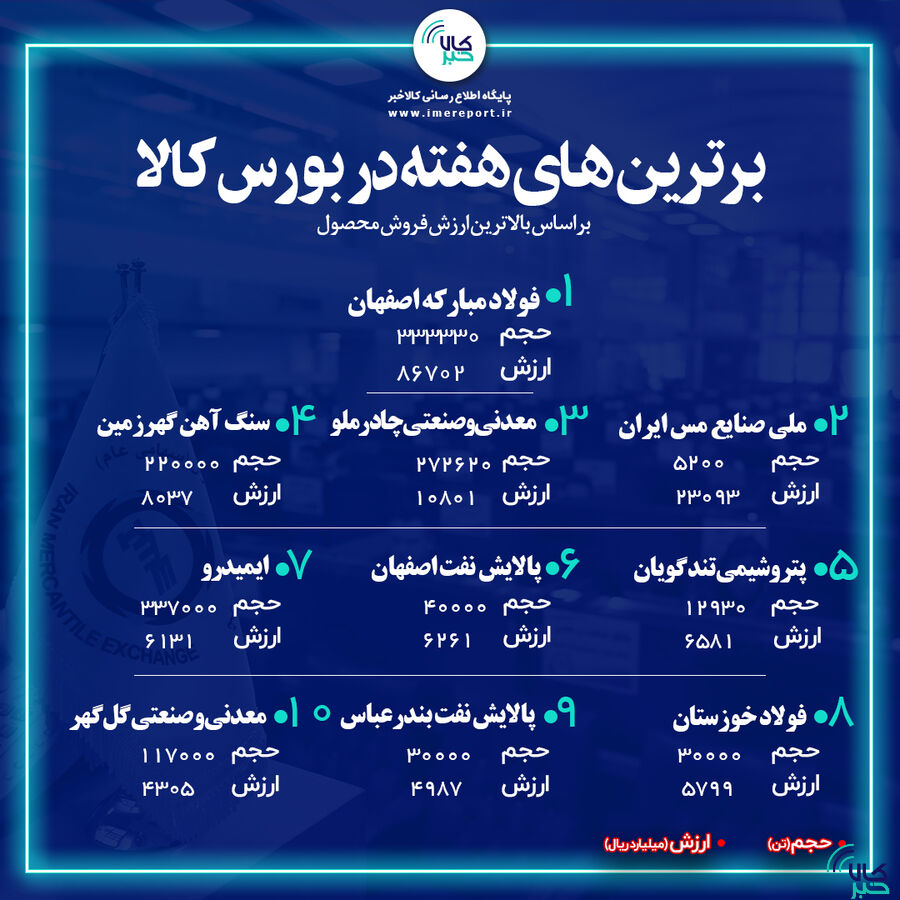 فولاد مبارکه اصفهان، ملی صنایع مس ایران و معدنی و صنعتی چادرملو ۳ شرکت برتری بودند که بیشترین فروش بازار فیزیکی بورس کالای ایران در هفته سوم فروردین ۱۴۰۲ را به ثبت رساندند.