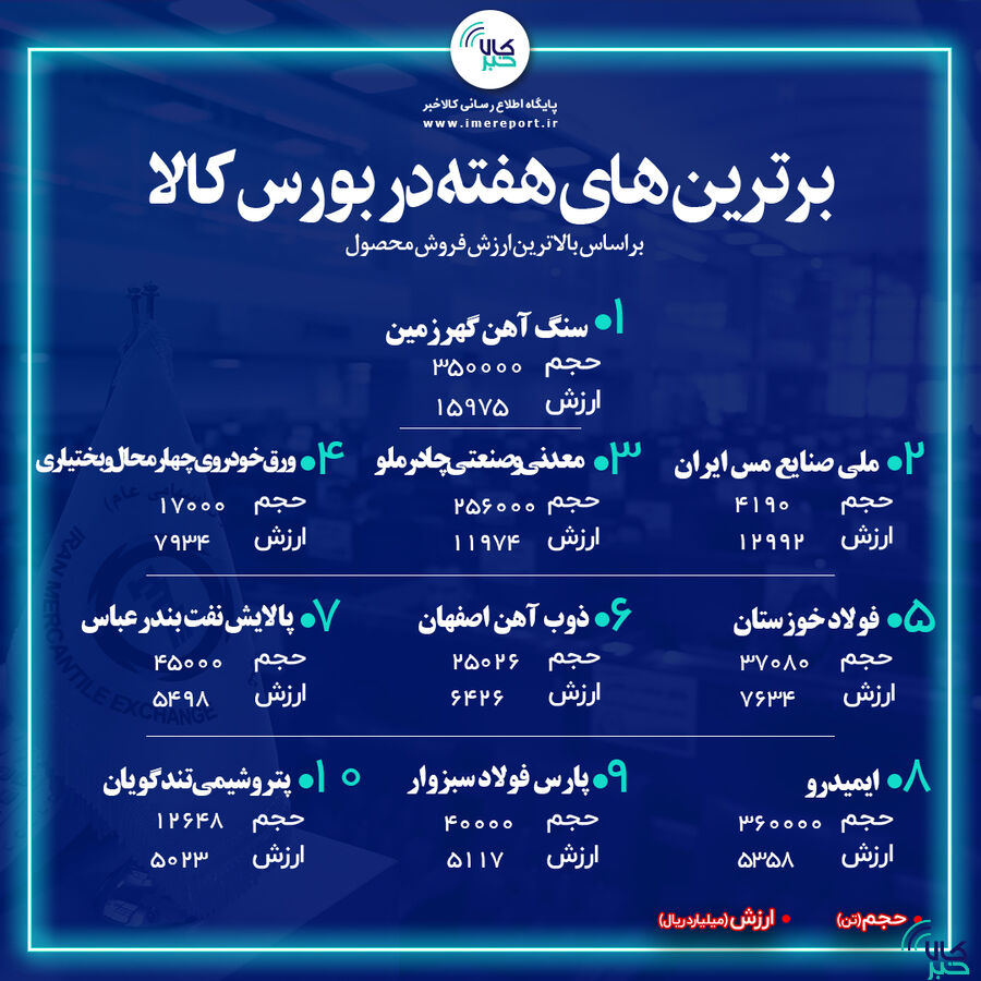 سنگ آهن گهرزمین، ملی صنایع مس ایران و معدنی و صنعتی چادرملو ۳ شرکت برتر بودند که بیشترین فروش بازار فیزیکی بورس کالای ایران در هفته سوم خرداد را به ثبت رساندند.