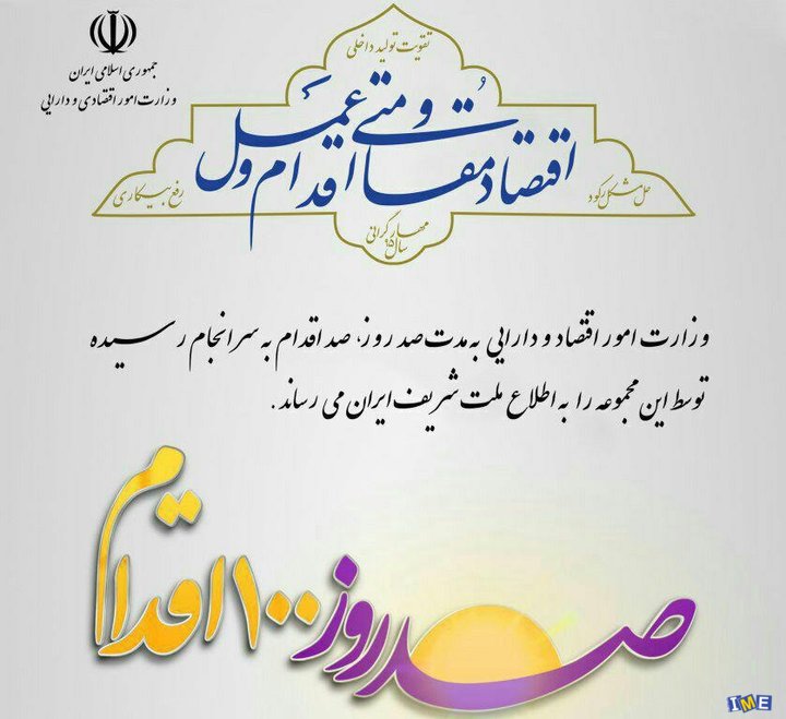 در پی رهنمود مقام معظم رهبری در خصوص انعکاس دستاوردهای دولت به مردم، وزارت امور اقتصاد و دارایی از سوم بهمن ماه جاری طی ۱۰۰ روز و به صورت روزانه ۱۰۰ اقدام و دستاورد این وزارتخانه را برای مردم بازگو می کند.