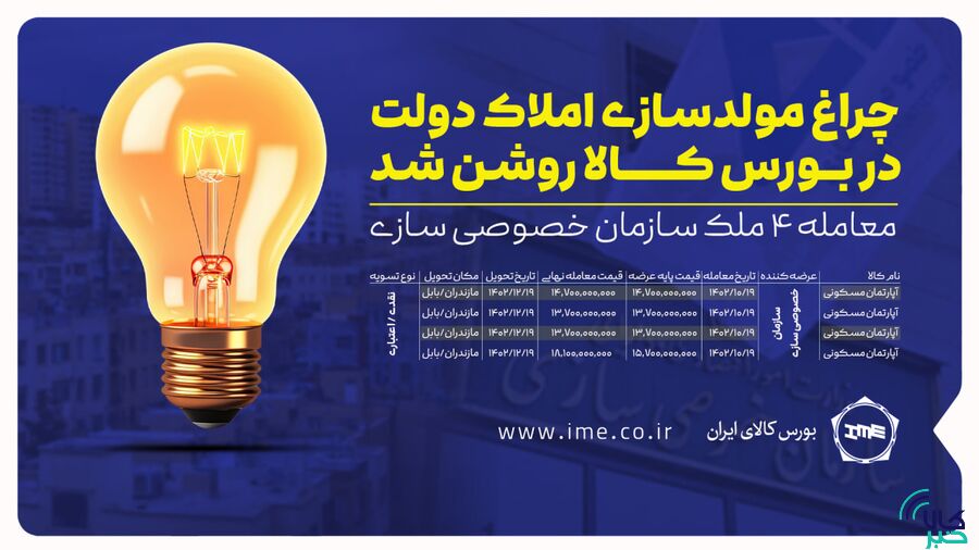 فرآیند مولدسازی املاک مازاد دولت از مسیر بورس کالای ایران، امروز با معامله ۴ ملک سازمان خصوصی سازی واقع در بابل آغاز شد تا همه اطلاعات و داده های فروش املاک دولتی به صورت شفاف و لحظه ای در دسترس عموم قرار بگیرد.