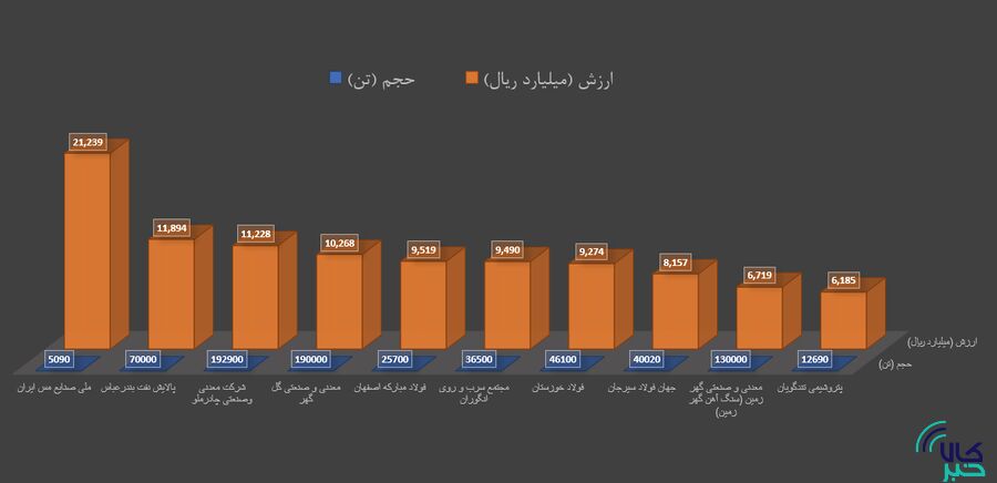 ملی صنایع مس ایران با معامله ۵ هزار و ۹۰ تن سولفور مولیبدن و انواع مس به ارزش ۲ هزار و ۱۲۳میلیارد تومان در رتبه نخست ایستاد.